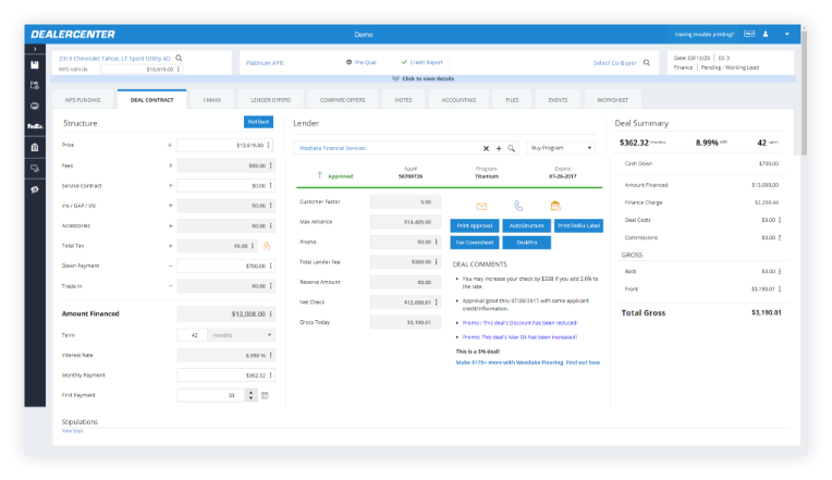 Using the customer’s desired down and monthly payment, you can instantly calculate the best deal structure with the highest net check.